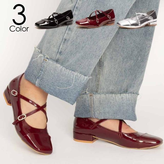 クロスストラップ パンプス ストラップパンプス レディース ストラップ パンプス ローヒール ヒール 痛くない スクエアトゥ 大人 ビジュー メリージェーン 靴 メリージェーンパンプス ブラック 黒 シルバー シューズ