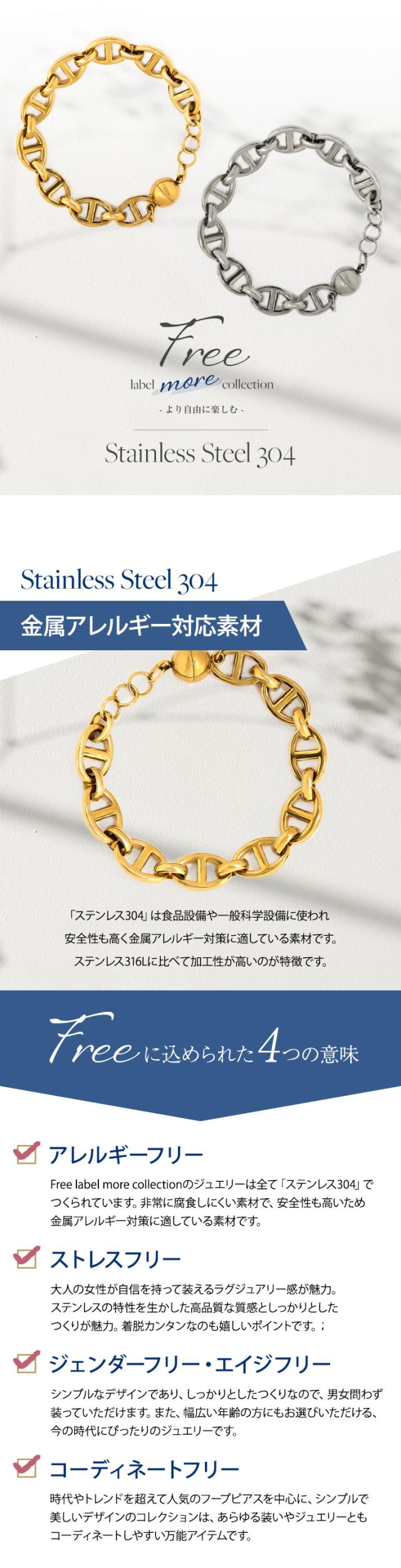 「 ステンレス304 」は、”錆びにくく変色も少ない”という特徴があります。そのため、汗などに接触しても金属が溶け出しにくく、アレルギー反応を起こしにくいので、近年金属アレルギー対応のジュエリー素材として使用されています。アレルギーの方でも安心・安全にオシャレを楽しんでいただきたいからこそ、素材にこだわりました。