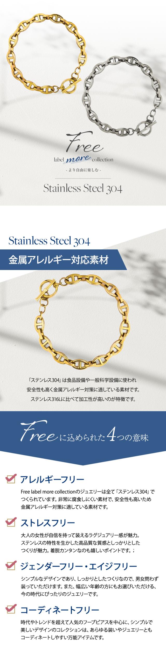 「 ステンレス304 」は、”錆びにくく変色も少ない”という特徴があります。そのため、汗などに接触しても金属が溶け出しにくく、アレルギー反応を起こしにくいので、近年金属アレルギー対応のジュエリー素材として使用されています。アレルギーの方でも安心・安全にオシャレを楽しんでいただきたいからこそ、素材にこだわりました。