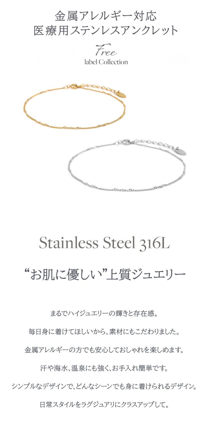| サージカルステンレス 「 ステンレス316L 」は、汗などに接触しても金属が溶け出しにくく、アレルギー反応を起こしにくい、「 金属アレルギー対応 」の肌に優しい素材です。インプラントなどの医療現場でも使われている素材です。ステンレスには必ず番号がありますので「 Stainless steel 316L 」など、番号が明記されている商品のご購入をおすすめします。 ”錆びにくく変色も少ない”ため、汗をかいてもかぶれない、かゆくならないことが多く、スポーツや「 つけっぱなし 」にされたい方にも人気。さらに、お好みのサイズに調節可能なアジャスター付きで、お好みの長さでご使用いただけます。女性だけでなく男性にもおすすめです。" ノンアレルギー "対応の「 アレルギーフリーアンクレット 」として、ジュエリースタジオ プラスターの【 フリーレーベルコレクション 】が好評を得ています。 ※こちらの商品は、医療用の器具に使用しているステンレスと同じ素材のステンレスになりますが、医療器具ではありません。アレルギー反応には個人差がございますので、全ての方に適合するものではありません。 |