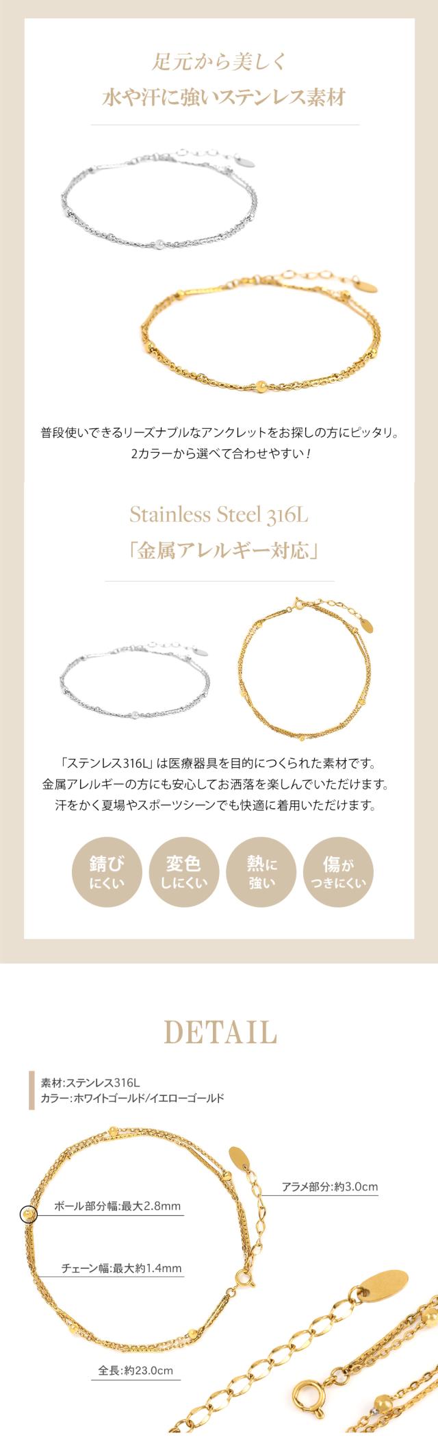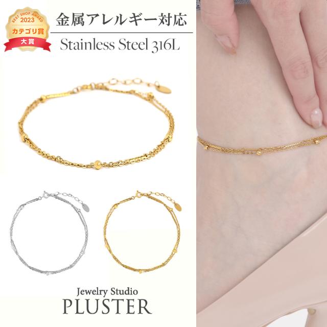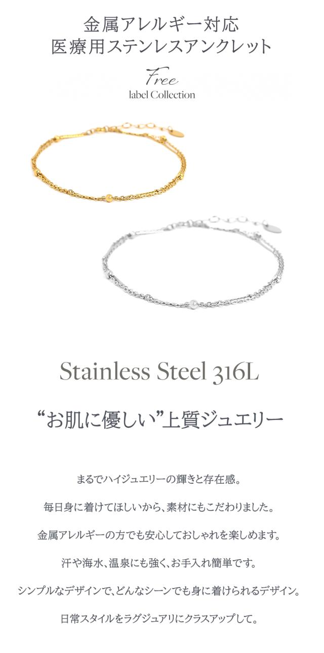 「 アンクレット 」× ジュエリー感のある洗練された質感シルエットと輝きの美しいエレガントなアンクレット。女性の足首を華奢に細く見せてくれます。シンプルなデザインで、重ね付けにもおすすめです。「 ステンレス 316L 」は金属アレルギー対応で、お肌に優しく安心です。