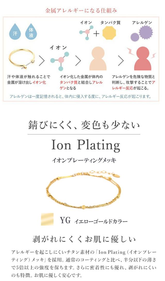 「 金属アレルギー 」を起こしにくいチタン素材の「 IonPlating ( イオンプレーティング )メッキ 」を採用。通常のコーティングと比べ、半分以下の薄さで5倍以上の強度を保ちます。さらに密着性にも優れ、剥がれにくいのも特徴。お肌に優しく安心です。