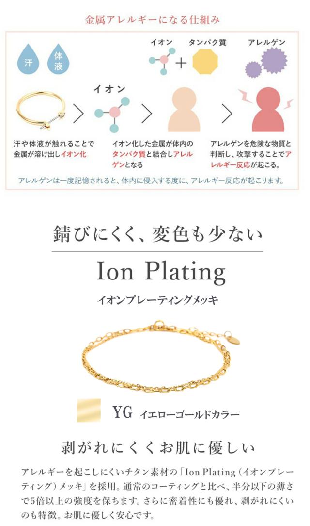 「 金属アレルギー 」を起こしにくいチタン素材の「 IonPlating ( イオンプレーティング )メッキ 」を採用。通常のコーティングと比べ、半分以下の薄さで5倍以上の強度を保ちます。さらに密着性にも優れ、剥がれにくいのも特徴。お肌に優しく安心です。
