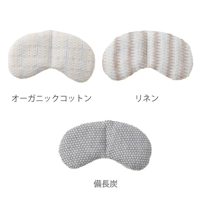 オーガニックコットンを64%配合したもの、麻を63%配合したもの、備長炭を配合したもの、3種類から選べます。天然素材なので、お肌にも優しくて、使い心地も良い、夏冬兼用アイピローです。