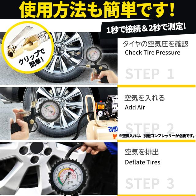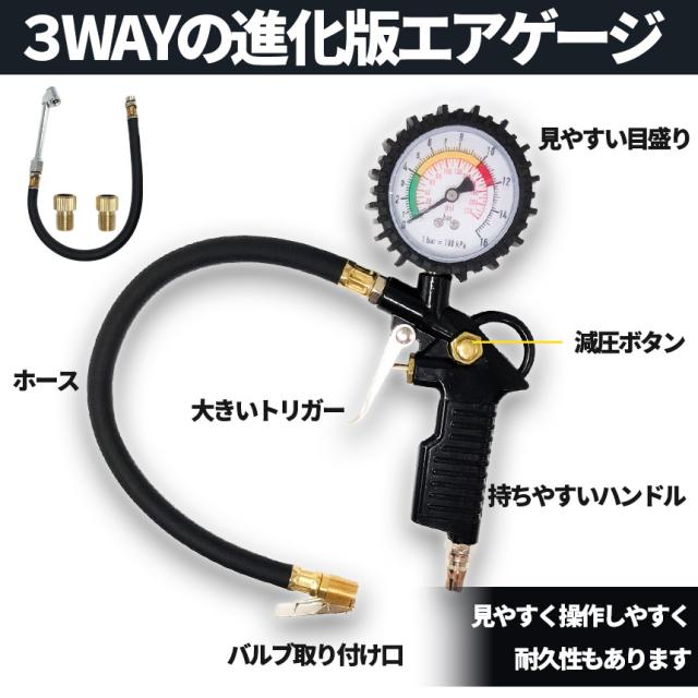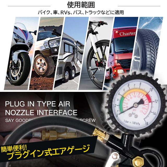 【一台3役】空気充填・タイヤ圧測定・空気抜き3つの機能が備わっており、常にタイヤの状態を確認でき安全運転をサポートします。仏式を米式にできるバルブ付き。(※空気充填の場合は別途エアコンプレッサーが必要です。)【対応性豊か】エアコンプレッサーとの併用は一本のレバーで行えます。インフレータ、ダイレクトロックチャック、圧力計、ホース、デフレバルブが1つに。デフレ、空気圧チェック機能を備えています。 1/4インチおよび1/2インチNPTエアコンプレッサー出力に対応。