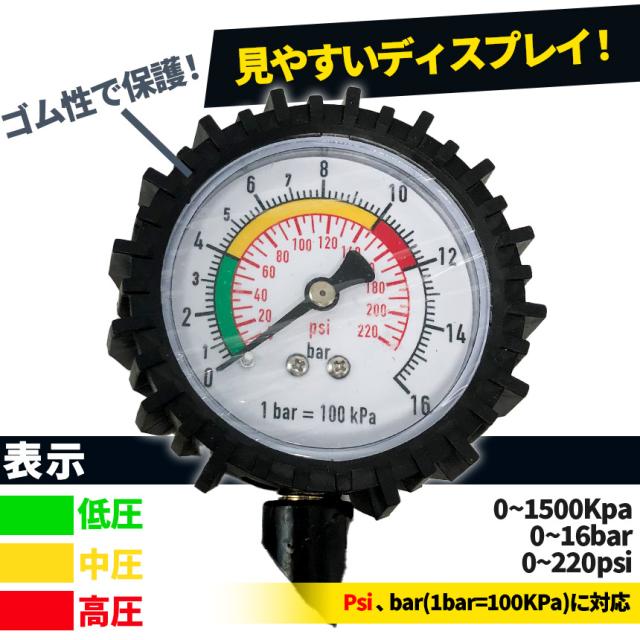 【測定範囲】精度:±1%;0〜220PSI/1500KPA/16BARの、3つの測定単位が対応可能