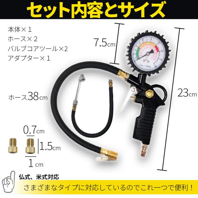 【パッケージ内容】エアゲージ、バルブx2、アダプターx1、ホースx2(1本は装着済み)