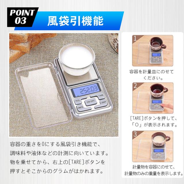 風袋機能が付いているので、容器や皿の重さを取り除くことができ、