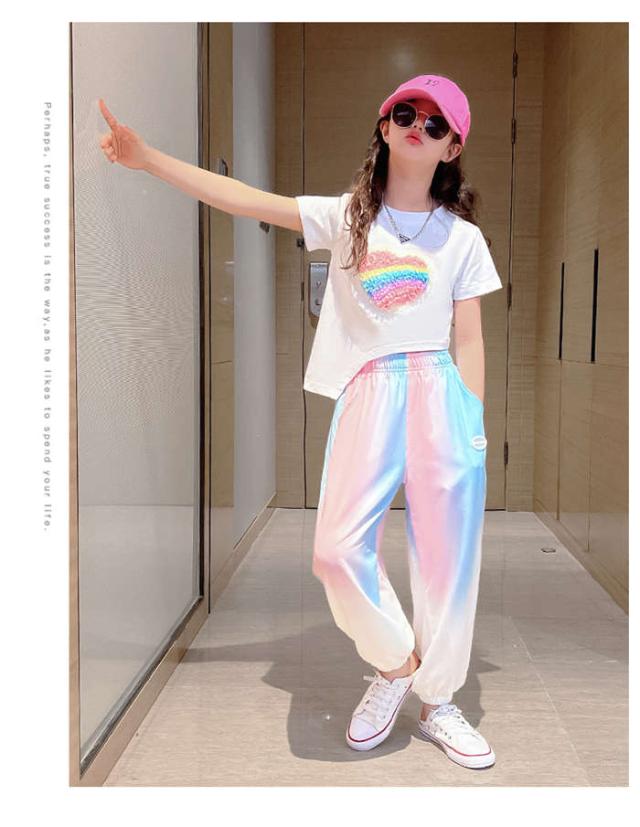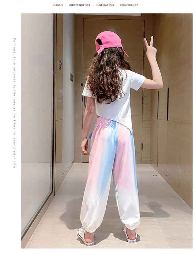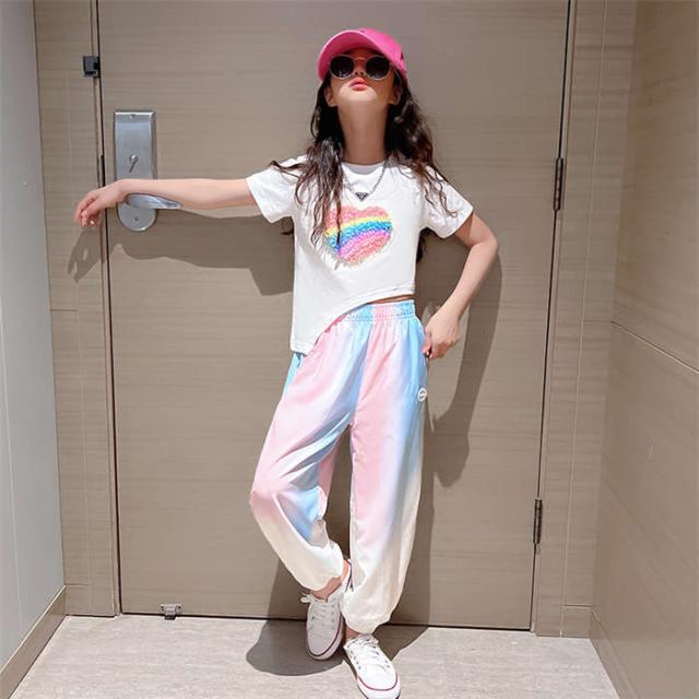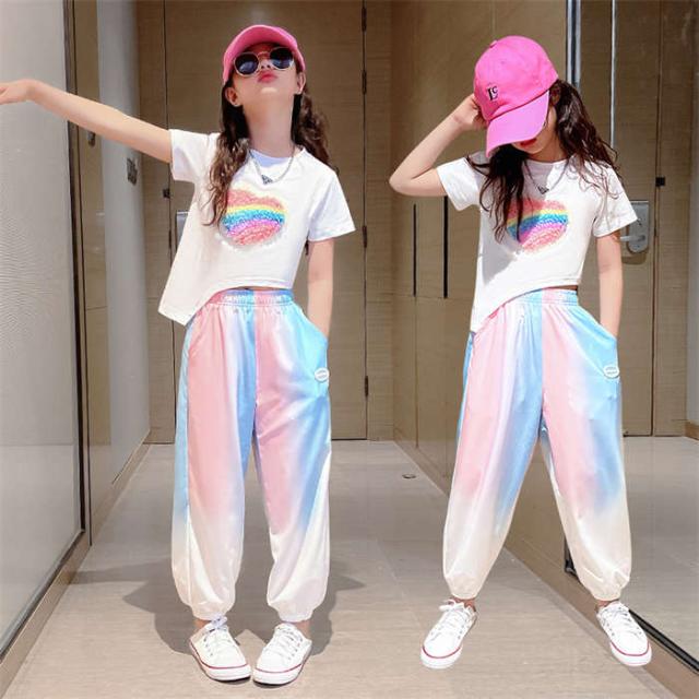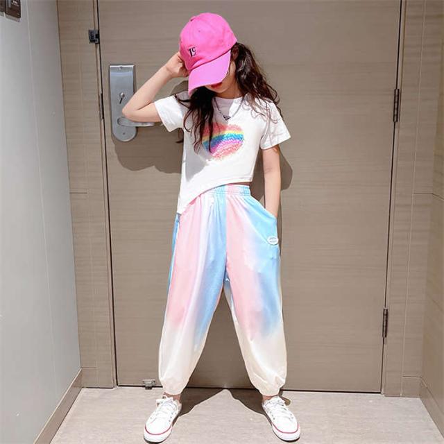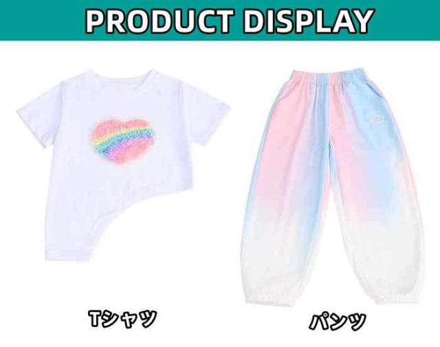 商品名:韓国子供服 女の子 Tシャツ 長ズボン ダンス衣装 ロングパンツ トップス 上下セット ダンスウェア 丸首 半袖 ヒップホップ 子ども服 夏服 舞台服 個性 ファッション 普段着 外出着 ジュニア服 練習着 ガールズ コーデ オシャレ チア 旅行 110cm 120cm 130cm 140cm 150cm 160cm 170cm