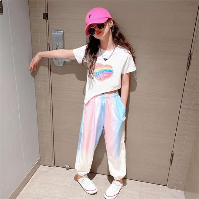 韓国子供服 女の子 Tシャツ 長ズボン ダンス衣装 ロングパンツ トップス 上下セット ダンスウェア 丸首 半袖 ヒップホップ