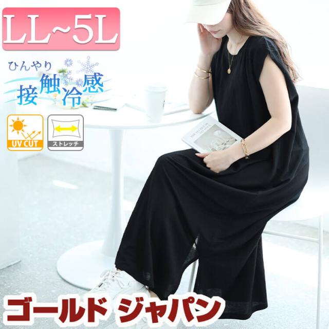 秋新作 大きいサイズ レディース ワンピース 接触冷感&UVカット&吸湿速乾タックスリーブワンピース ワンピ ロングワンピース 接触冷感 UVカット UV 吸湿速乾 ストレッチ スリット タック クルーネック 無地 夏服 秋服 春服 LL 2L 3L 4L 5L ブラック 黒 ゴールドジャパン
