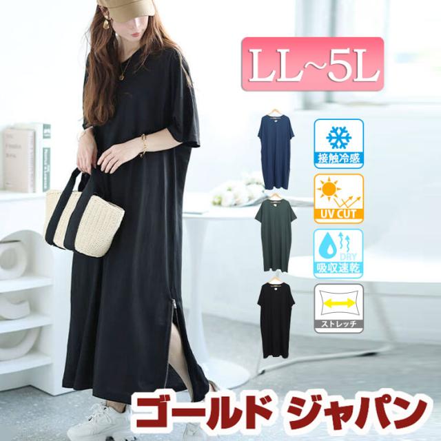 秋新作 大きいサイズ レディース ワンピース 接触冷感&UVカット&吸湿速乾サイドファスナーワンピース ワンピ ロングワンピース 接触冷感 UVカット UV 吸湿速乾 ストレッチ ドルマン Vネック 夏服 秋服 春服 LL 2L 3L 4L 5L グリーン ブラック 黒 ブルー ゴールドジャパン