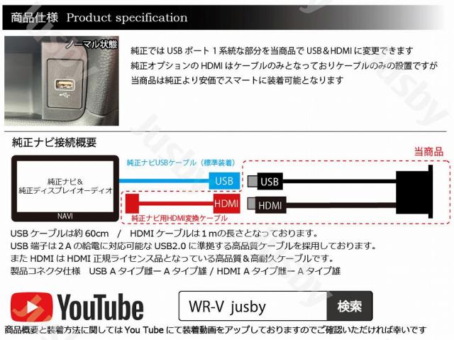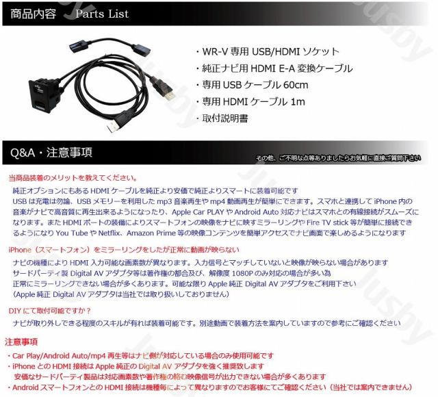 | ・WR-V専用ソケット ・純正ナビ用変換ケーブル タイプE ・専用USBケーブル ・専用HDMIケーブル ・取付説明書 |