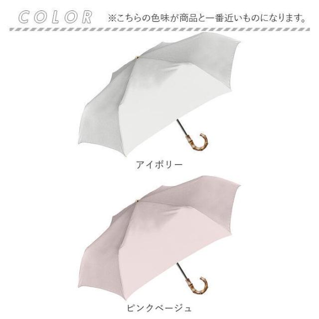 【自然な風合いのバンブーハンドル】良質の天然の竹が柔らかい印象のハンドル。自然な風合いでオンもオフも使える折りたたみ傘。【コンパクトで晴雨兼用の優れモノ】畳めばコンパクト&軽量★晴雨兼用の折り畳み傘なのでお出掛け時の必需品に♪【傘の下はまるで木陰のような涼しさ】遮光率100%で紫外線カットし、熱を30%遮断する遮熱効果も。強い日射しや熱をしっかりと遮る。【反射光を防いでまぶしさを軽減】内側をブラックコーティングにすることで、反射光をブロックし、まぶしさを軽減。【夏の紫外線対策や熱中症対策に】安心のUVカット99.9%、UPF50+で夏の紫外線対策や熱中症対策に活躍。【雨の日も大活躍】撥水等級5級の最高ランクの撥水力で、急な雨でもしっかり防ぐ撥水力。【折りたたみでも濡れたくない】親骨約55cmあるので傘生地を広げれば直径約98cmあり。折りたたみだからと言って濡れたくない!【しなやかな耐風仕様】強風を受けた時にあえて反り返ることで、風の衝撃を逃すので丈夫。【グラスファイバー使用】荷物が多くなりがちな雨の日に嬉しい超軽量タイプ。錆びにくいのも嬉しいポイント。【安心の手開きタイプ】ゆっくりとひらくことができる、安心の手開きタイプ。安全カバーつきで指を挟みにくい◎【スナップボタンタイプ】傘生地がスムーズにまとまる、スナップボタンタイプの留めバンドを採用。【細やかな配慮が嬉しい】手持ちのハンドルがU字で持ちやすかったり、石づき部分が尖っていなく安心。