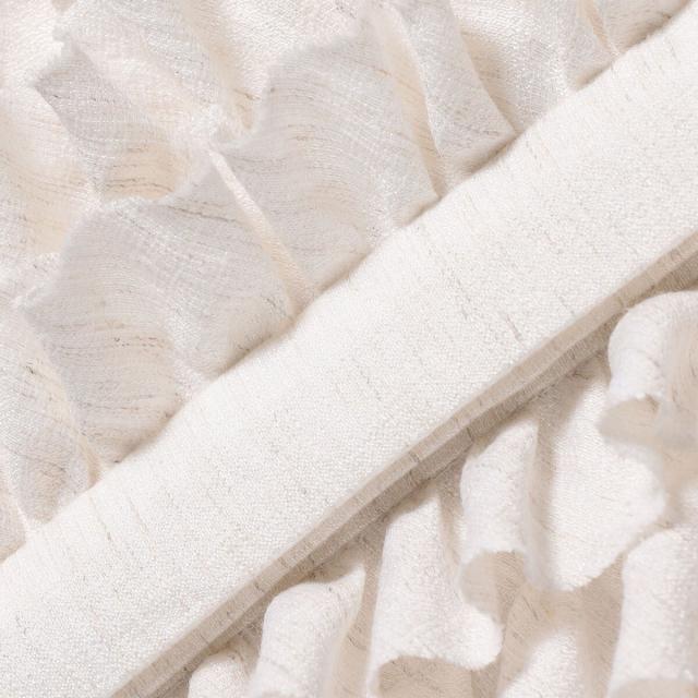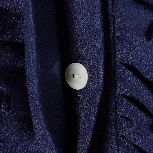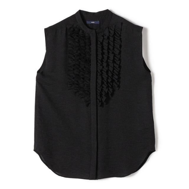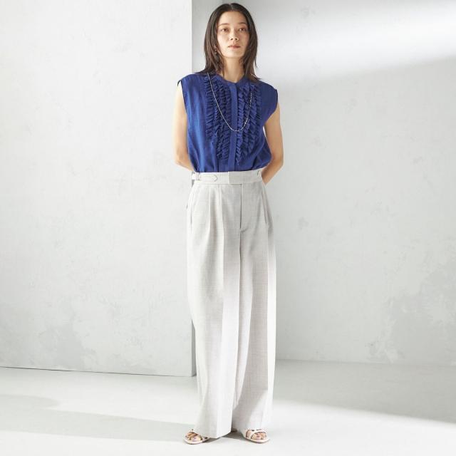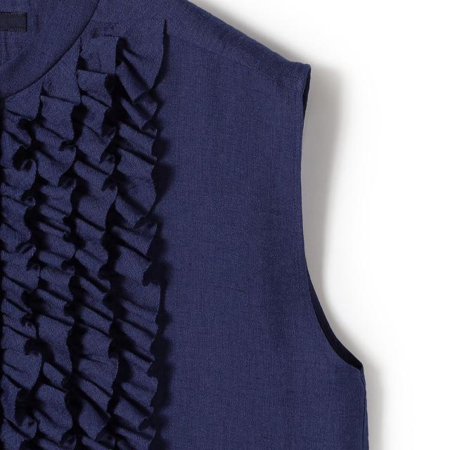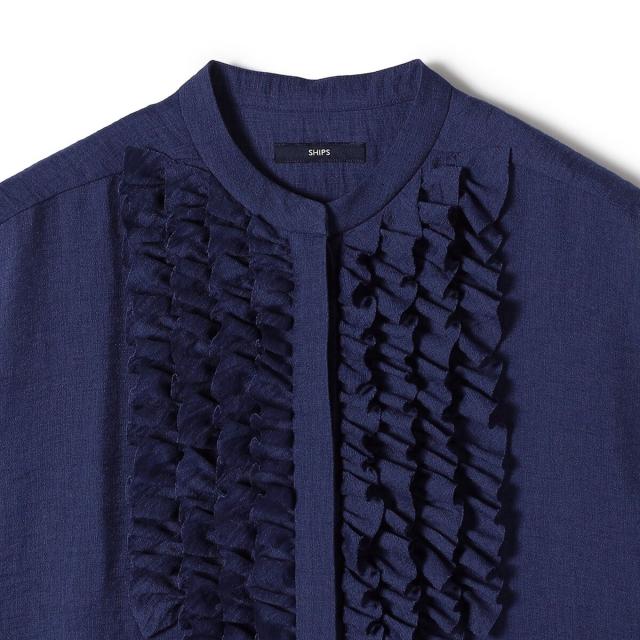 首回りはすっきりとしたバンドカラーで、甘すぎず大人っぽいバランスで入ったたっぷりのフリルが魅力。
