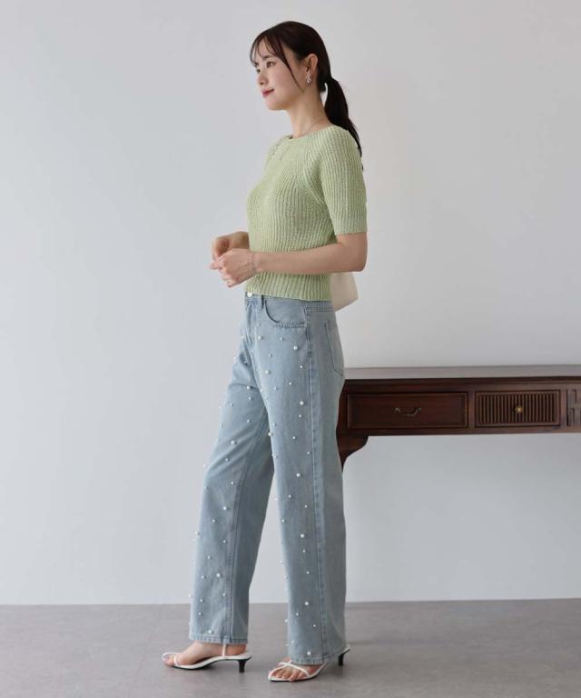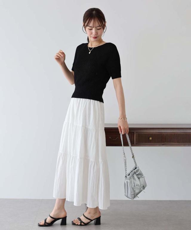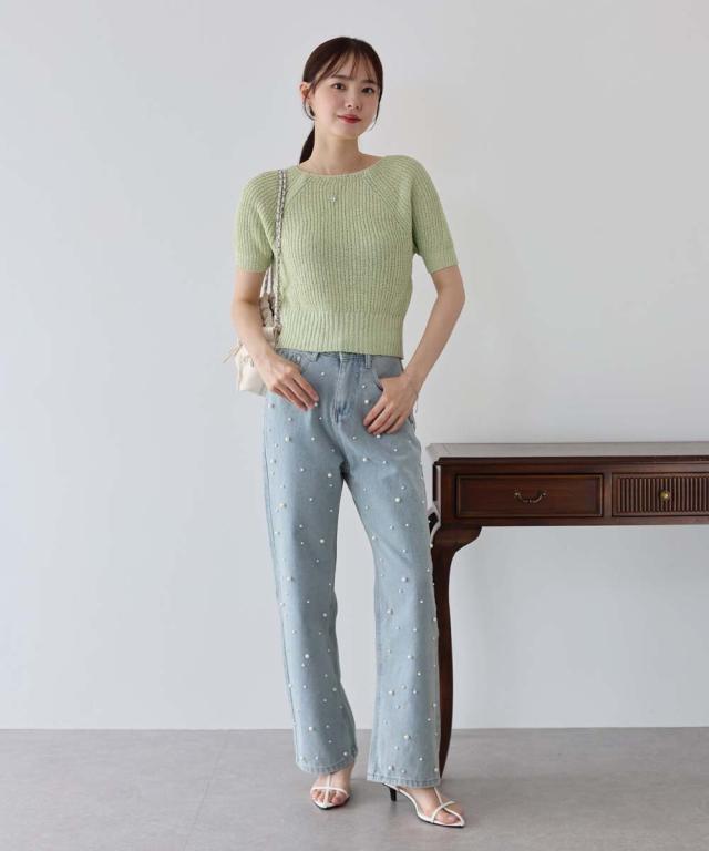 シンプルなボトムに合わせるだけでも、メッシュ編みがアクセントになり華やかな印象。