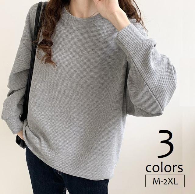 長袖プルオーバー レディース トップス ワッフル カットソー クルーネック ドロップショルダー オーバーサイズ ゆったり 無地
