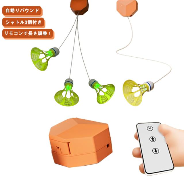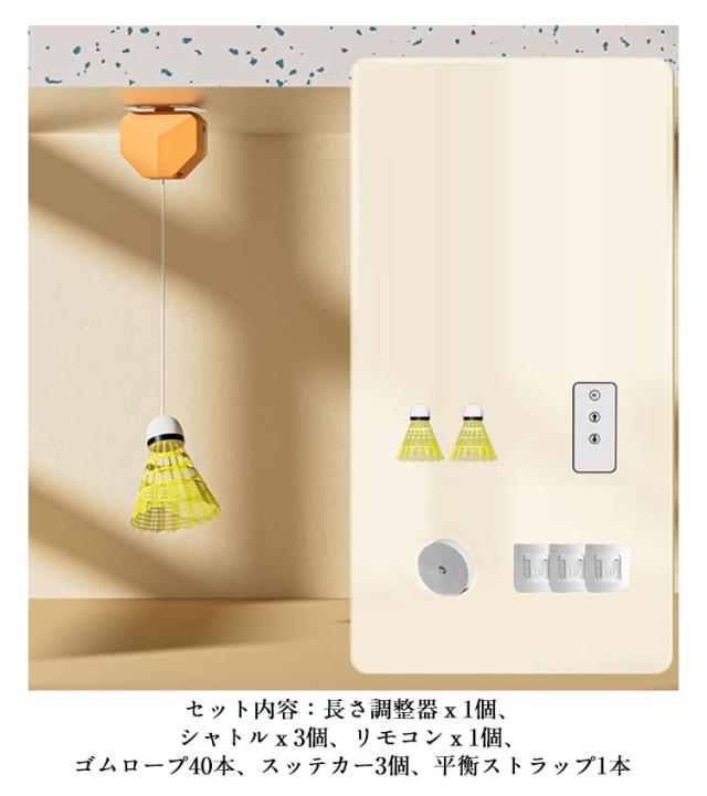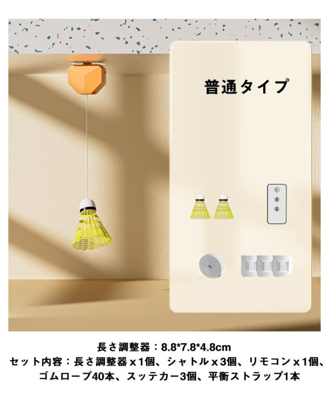 | 【リモコンで長さ調整!】【自動リバウンド】【シャトル3個付き】 セット内容:長さ調整器x1個、シャトルx3個、リモコンx1個、ゴムロープ40本、スッテカー3個、平衡ストラップ1本 ボールを拾う必要がなく、自宅で楽しく楽しくバドミントントレーニングできます。 リモコンで調節可能なコードの長さを備えたリバウンドトレーナーでトレーニングを強化する。 長さ調整できるので子どもでも扱いやすく、当たりやすい設計。 ボールをさまざまな角度や速度で跳ね返せるため、一人での練習に最適です。 ナイロン製のこのバドミントントレーナーは、持久力を強化し、打撃の練習に役立ちます。 簡単に取り付けられます。どこにでも設置できるので多用途に使えて便利です。 | |