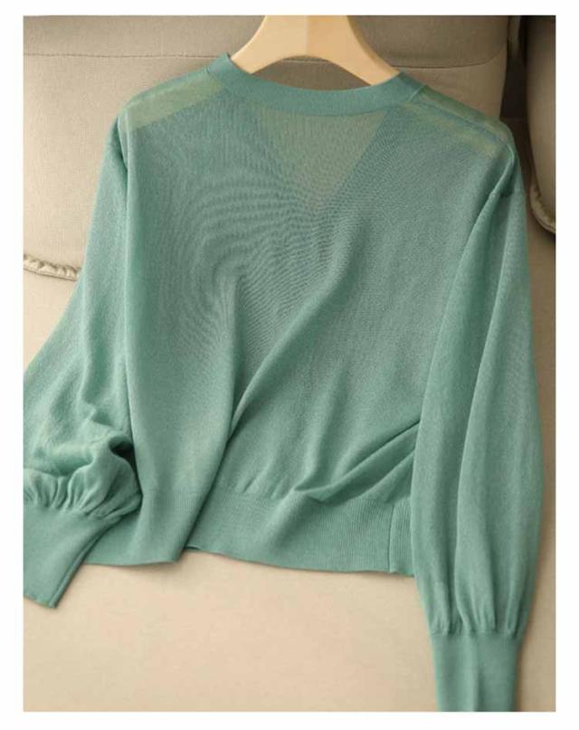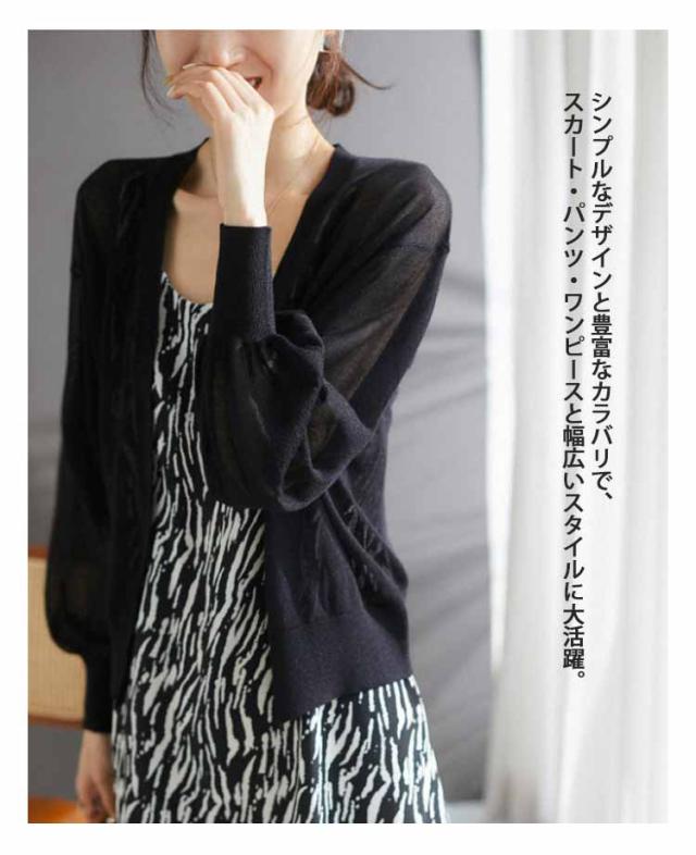Vネック 無地 シアーニット 長袖 トップス オフィス 透け感 夏 UVカット シアーニット 春夏秋 薄手 通勤 パフスリーブ カーディガン UVケア カジュアル ナチュラル 黒 レディース 冷房対策 涼しい サマーカーディガン