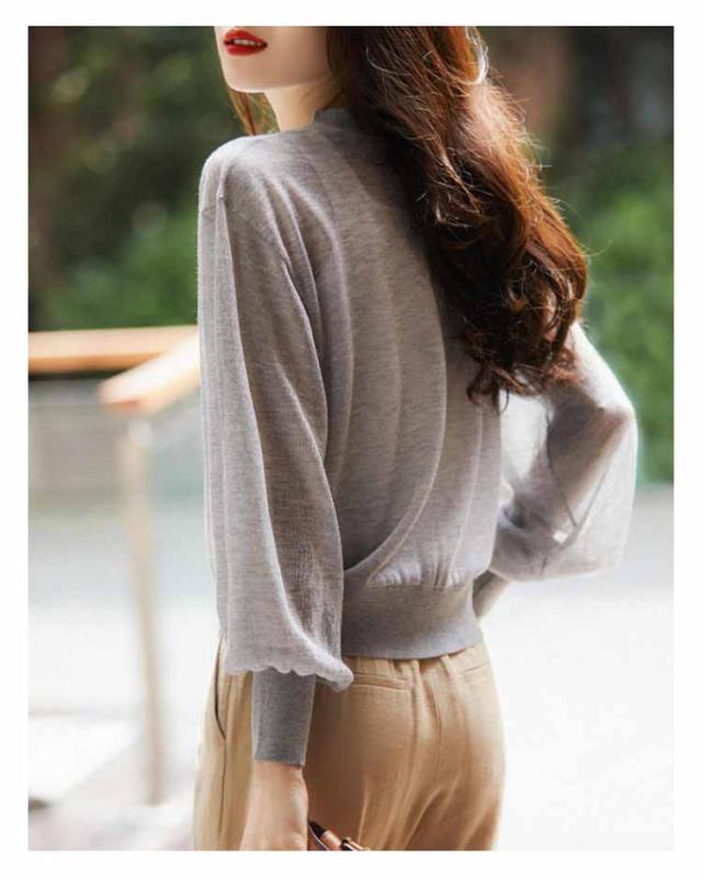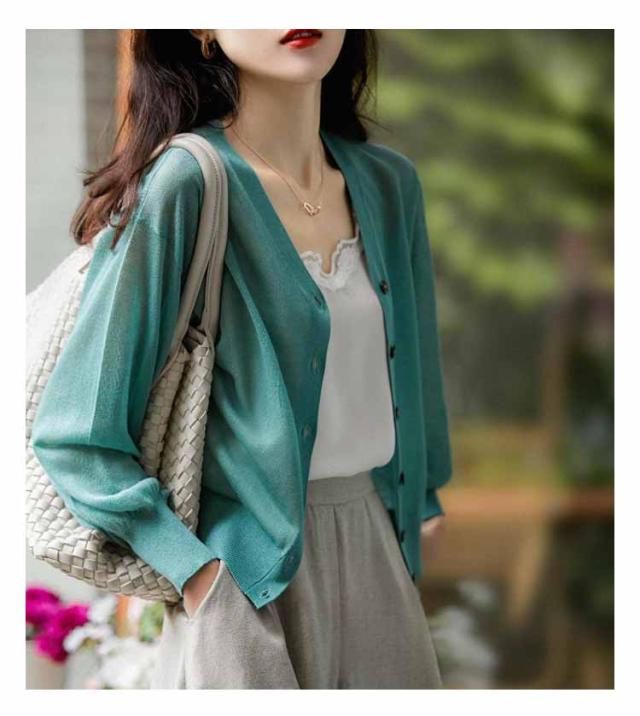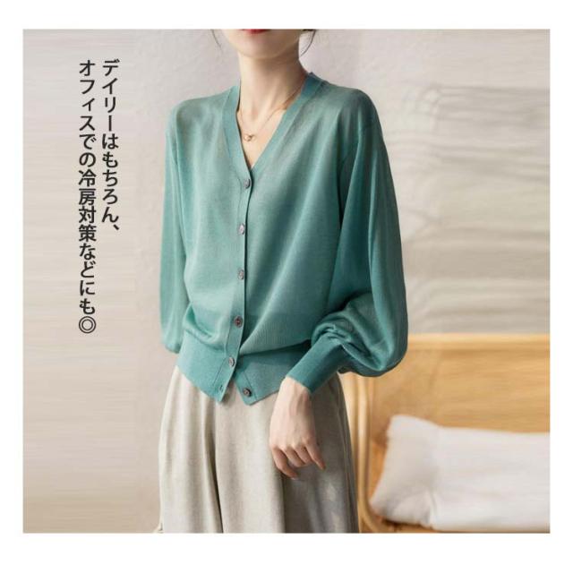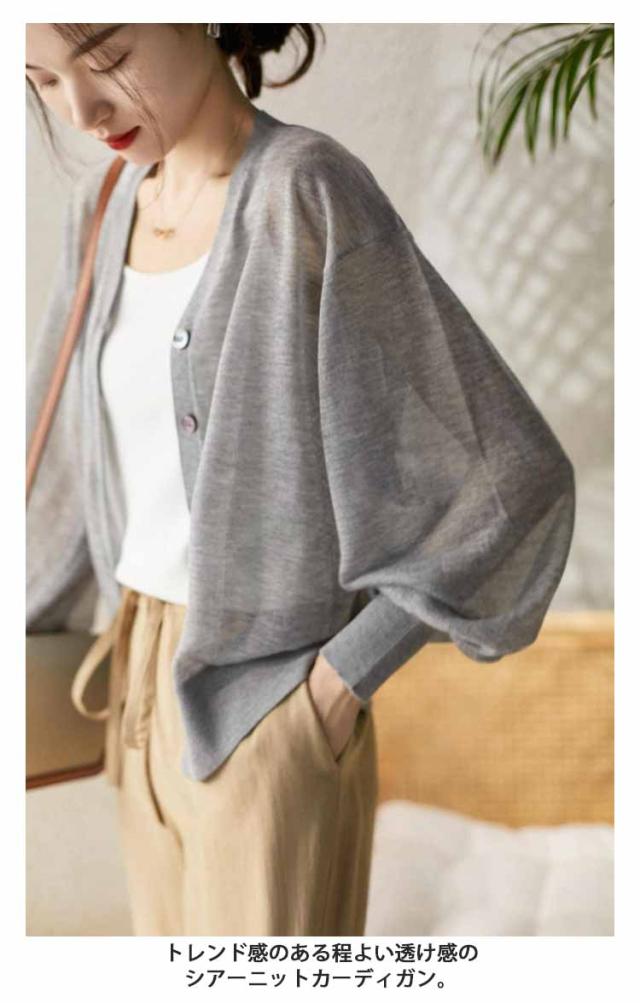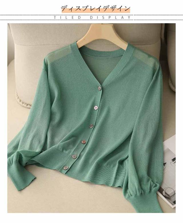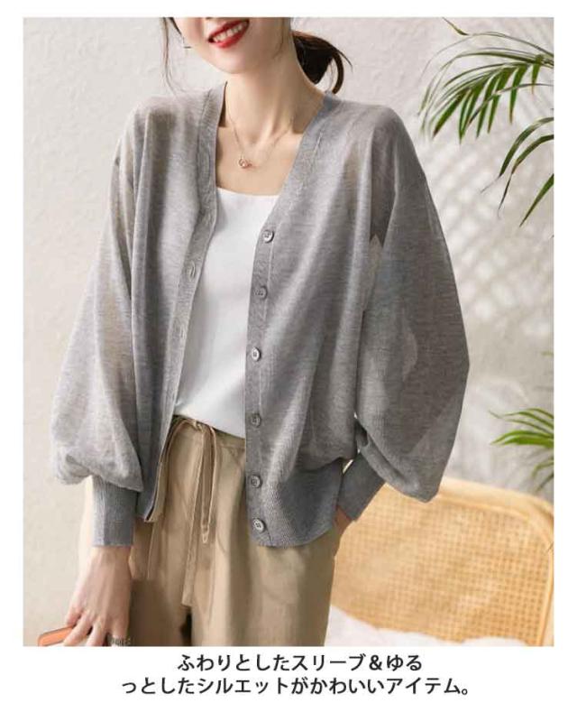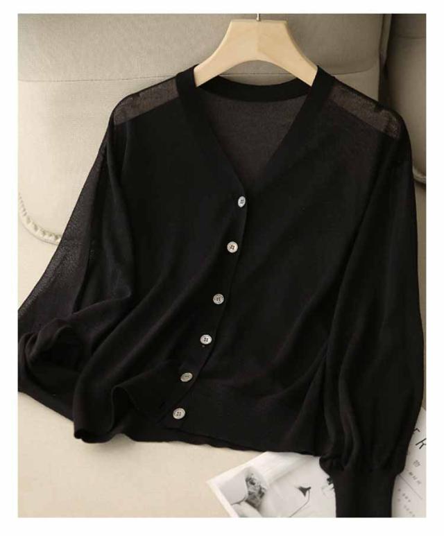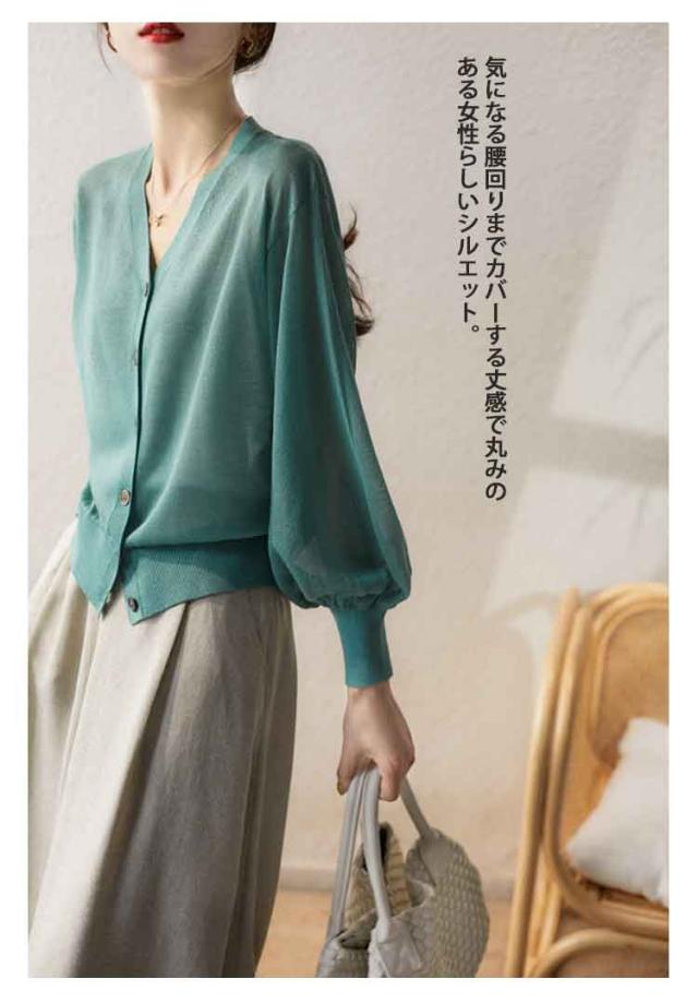 シアーニット Vネック パフスリーブ カーディガン レディース トップス 透け感 夏 通勤 オフィス 春夏秋 長袖 無地 薄手 UVカット UVケア カジュアル ナチュラル 黒 シアーニット 冷房対策 涼しい サマーカーディガン