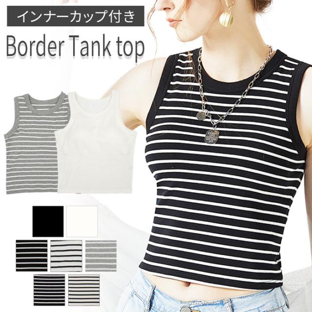 ・快適な着心地のカジュアルな無地とボーダー柄のカップ付きタンクトップ