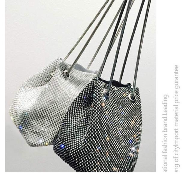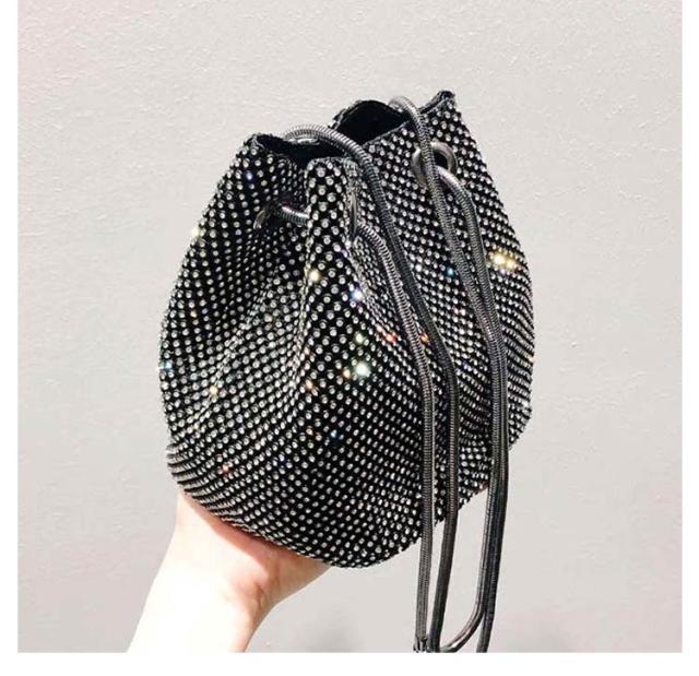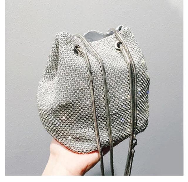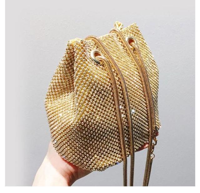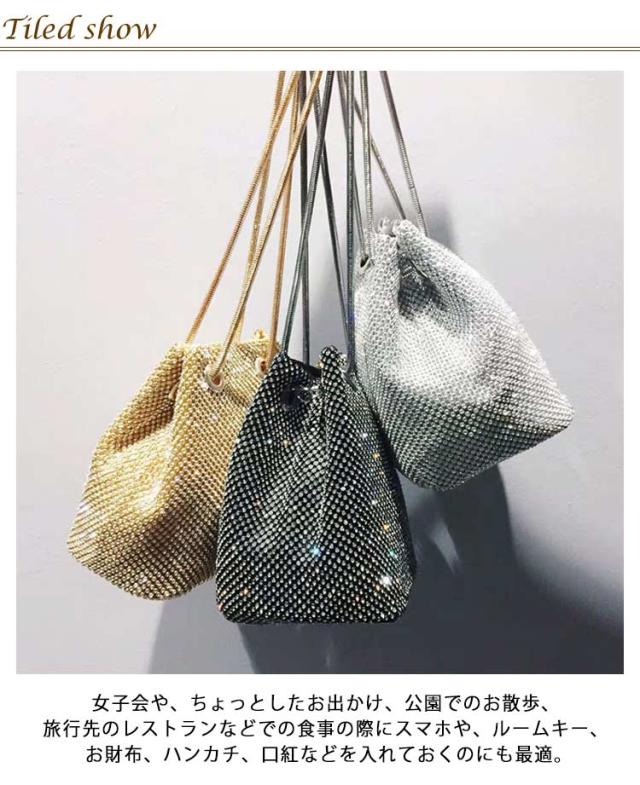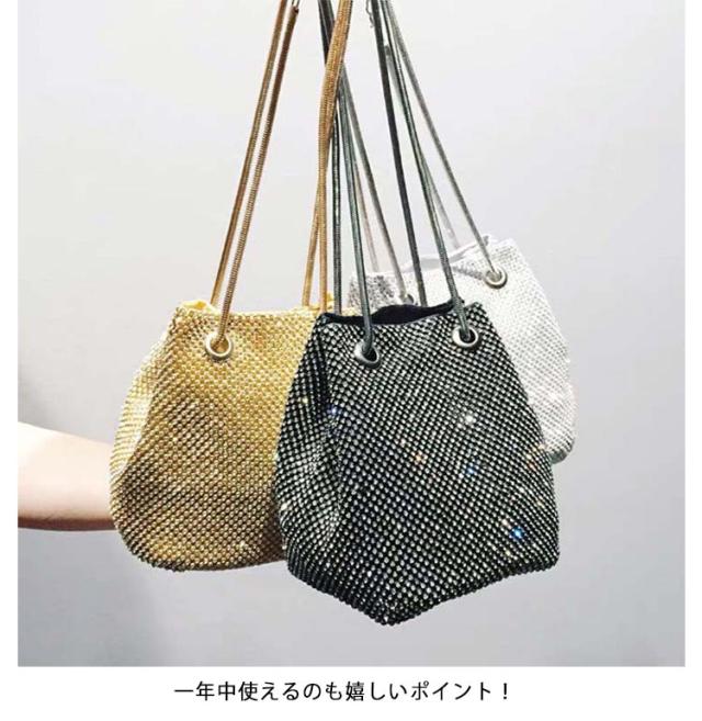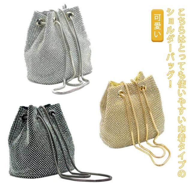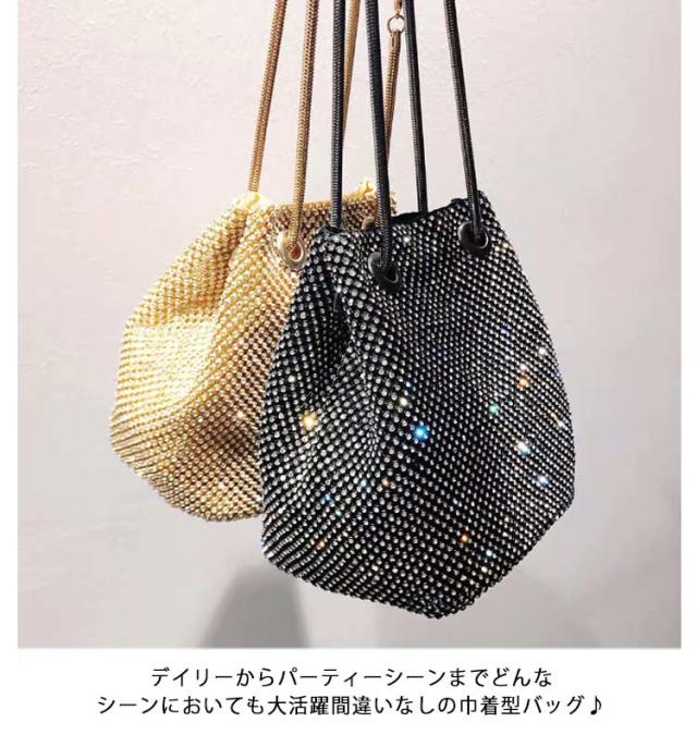 ショルダーバッグ ラインストーン チェーン 巾着バッグ バケツバッグ パーティーバッグ 鞄 上品 きれいめ 斜め掛け ミニ ポシェット 肩掛け きらきら 小さめ 可愛い おしゃれ 女性 ゴールド シルバー ブラック