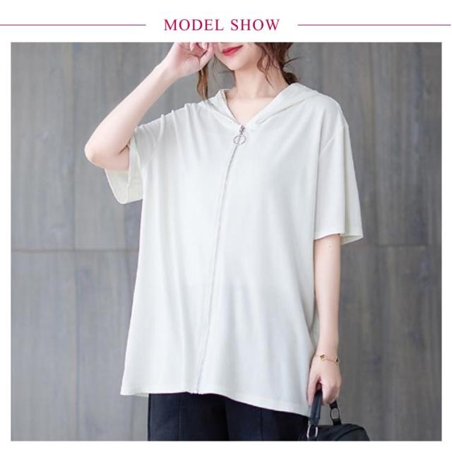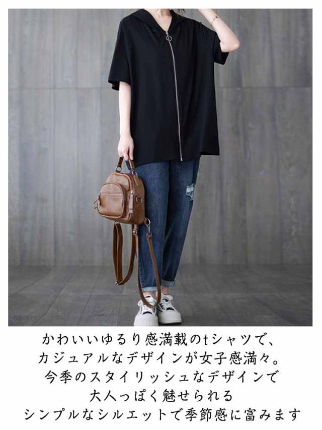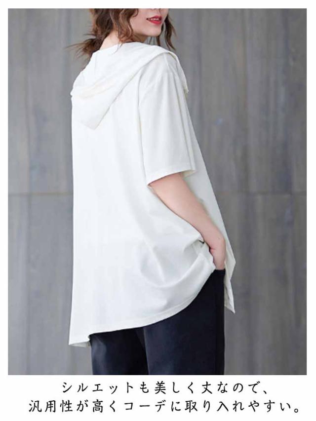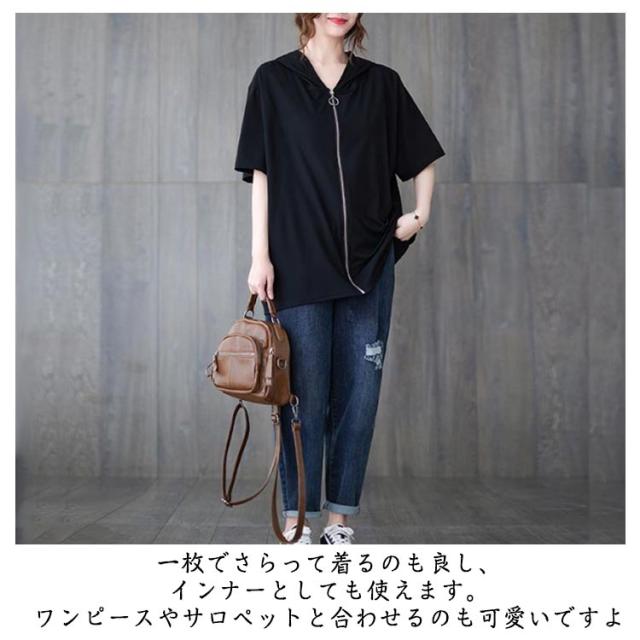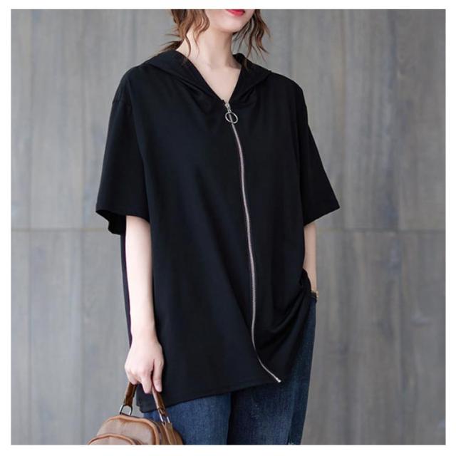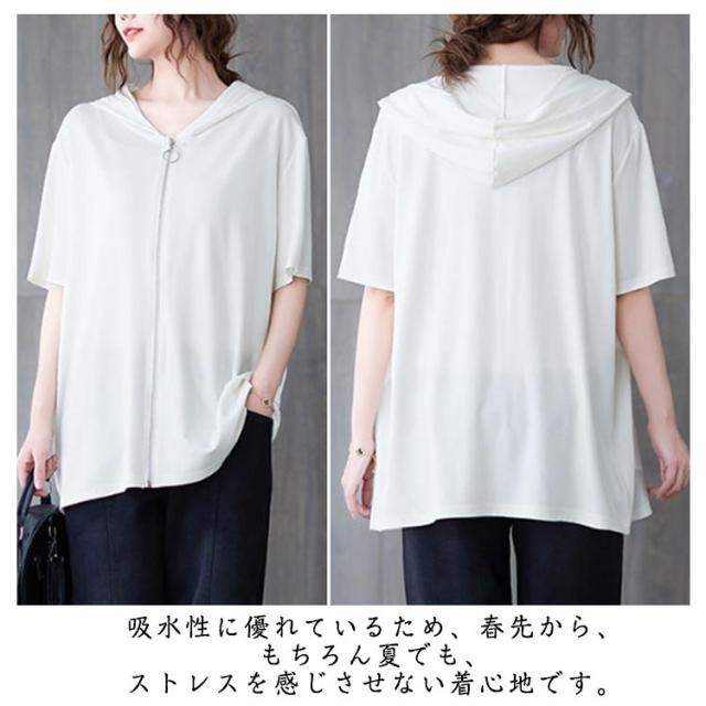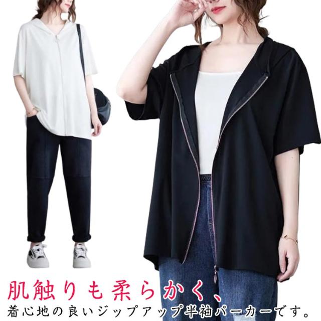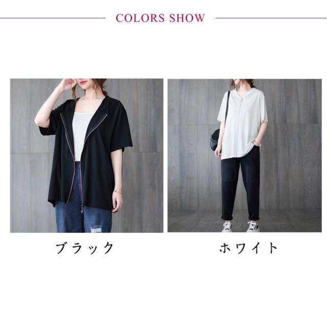 パーカー レディース 半袖 ジップアップ フード付き 夏 無地 トップス カジュアル Tシャツ ビッグシルエット 前開き カーディガン ライトアウター 羽織り シンプル 体型カバー フード付き ブラック ホワイト