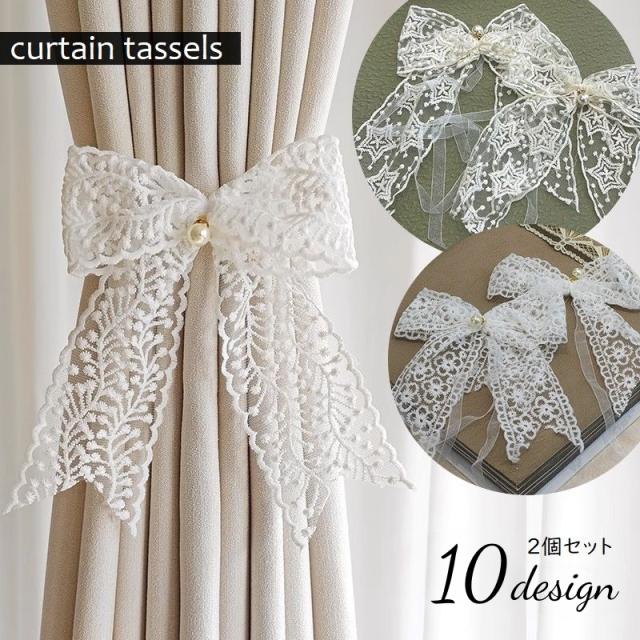 カーテンタッセル 2個セット リボン 蝶結び カーテン留め 刺繍レース カーテン束ね 可愛い パール調チャーム付 花柄 星柄 ホ