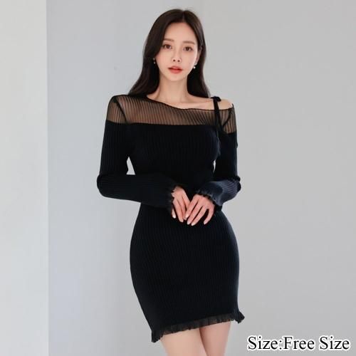 身体にフィットするニット素材が女性らしいボディラインを生み出し、デコルテをシースルーにすることで抜け感あるデザインに。