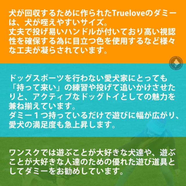 犬が回収するために作られたTrueloveのダミーは、犬が咥えやすいサイズ。