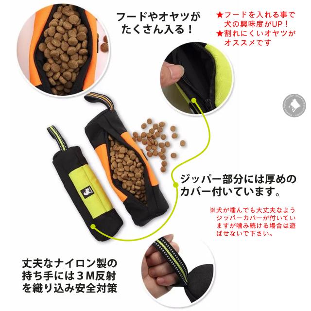 ダミーの中におやつを入れて投げ、愛犬が取ってきたらファスナーを開けておやつをあげることで「持って来い」を簡単に教えられます。