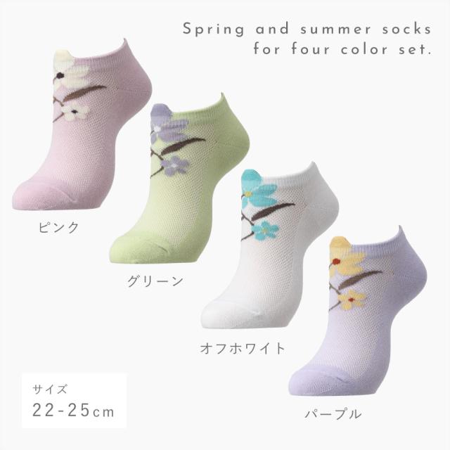 靴下 スニーカー レディース,くるぶし 靴下 レディース,靴下 レディース 夏用,靴下,ソックス,春,夏,春夏,レディース,女性,女性用,婦人用,婦人靴下,4色組,4足,セット,薄手,薄い,薄め,スニーカー丈,くるぶし,スニーカーソックス,ロークルーソックス,メッシュ,通気性,風通し,風通しが良い,涼しい,涼しげ,さらさら,サラサラ,サラっと,さらっとしている,さらり,サラリ,爽やか,さわやか,べたつかない,ベタつかない,蒸れない,ムレない,蒸れにくい,ムレにくい,つま先,かかと,補強,丈夫,花柄,花,フラワー,くつした,くつ下,おしゃれ,お洒落,オシャレ,かわいい,可愛い,22-25cm,22cm,22センチ,23cm,23センチ,24cm,24センチ,25cm,25センチ,オフホワイト,ホワイト,白,ピンク,グリーン,緑,パープル,紫,