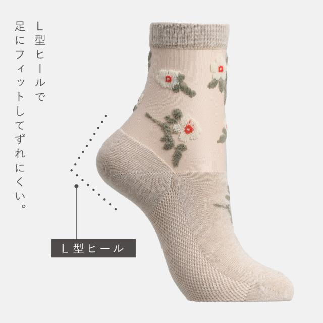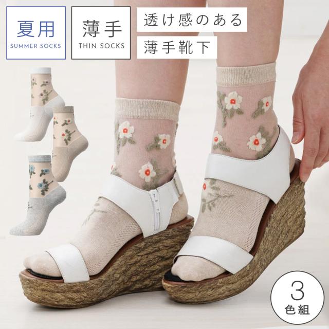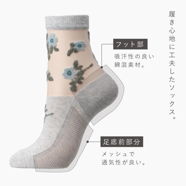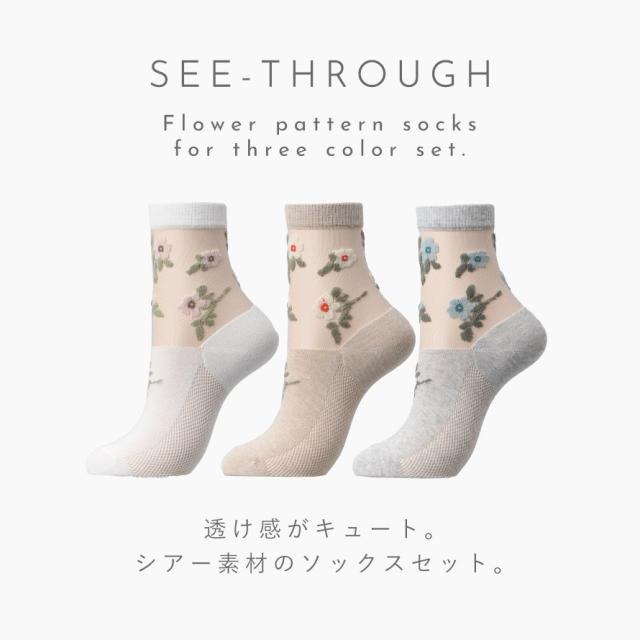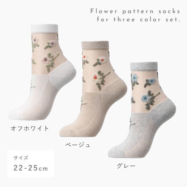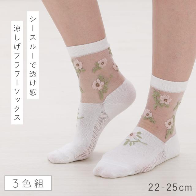 靴下 シースルー レディース 花柄 【3色組】22-25cm シースルーソックス シアーソックス 透け感 花 おしゃれ かわいい サンダル 夏 【 可愛くて涼しい シースルー靴下 】 まとめ買い 3足 夏用 メッシュ ズレない シースルー足底メッシュお花畑ソックス