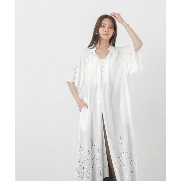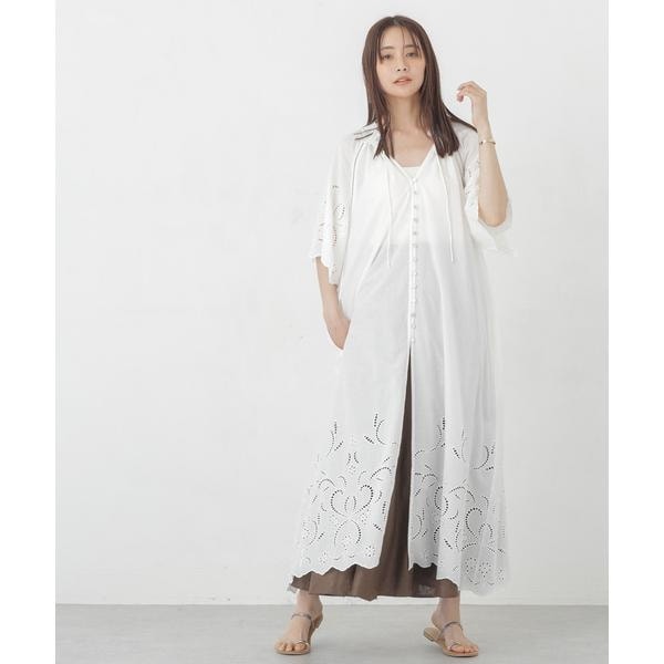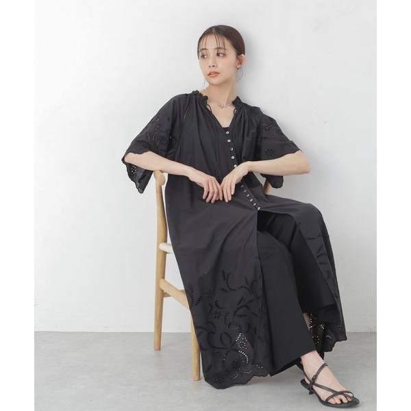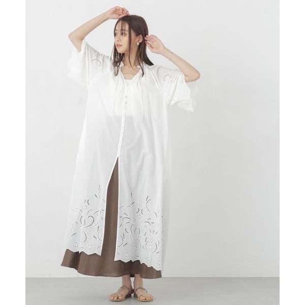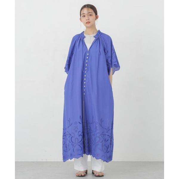裾・袖口に大胆にシフリー刺繍を施し、スカラップにカットした贅沢な作りのワンピース。フロントの貝ボタンがポイントで、盛夏のお出かけにもぴったりな一枚。サンダルや、カゴバック、麦わら帽子等、レジャー気分を盛り立ててくれるような小物アイテムとのコーディネートがおススメです。