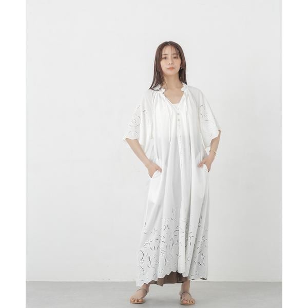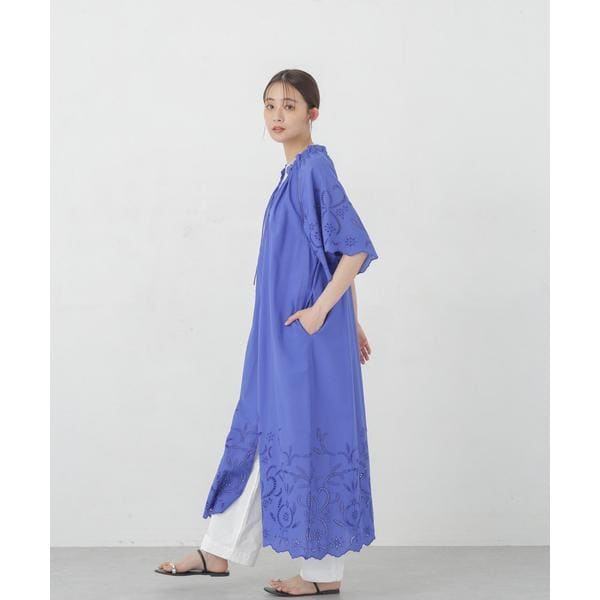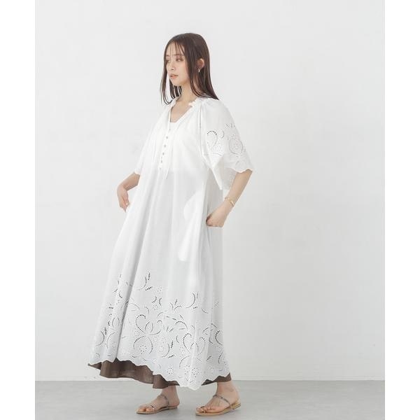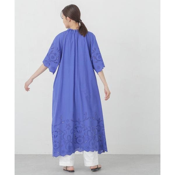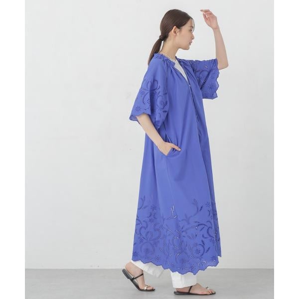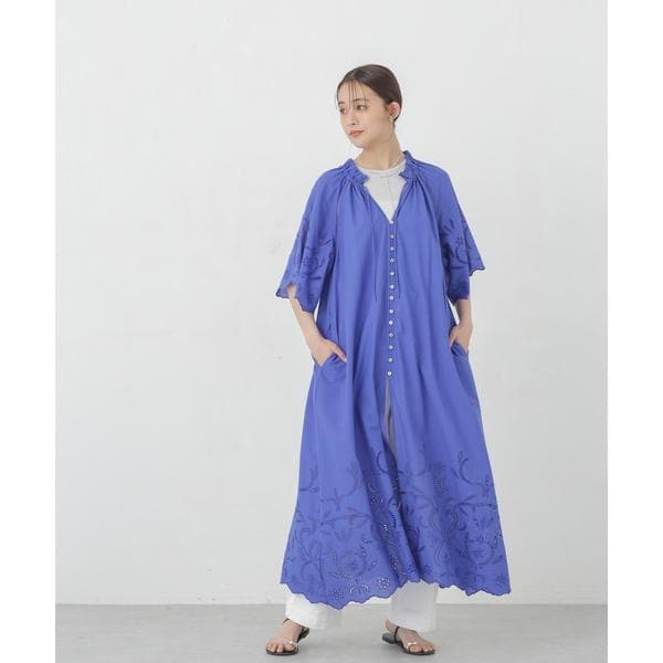 ・裾・袖口に大胆にシフリー刺繍を施し、スカラップにカットした贅沢な作りのワンピース
