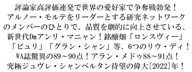 評論家高評価連発で世界の愛好家で争奪戦勃発! アルノー・モルテをリーダーとする研究ネットワーク のメンバーのひとりで、品質を劇的に向上させている、 新世代Dmアンリ・マニャン!銘醸畑「ロンスヴィー」 「ビュリ」「グラン・シャン」等、6つのリウ・ディ! WA誌驚異の89〜90点!アラン・メドゥ88〜91点! 究極ジュヴレ・シャンベルタン待望の偉大[2022]年!