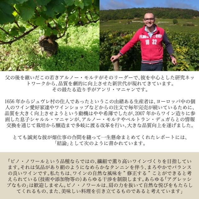 【(当店オーナー広瀬の体験談より)このドメーヌのワインを販売するにあたり当店オーナー広瀬も2009年秋と2010年春のブルゴーニュ訪問で感じた事として、会議の中で触れていました。特にこのアンリ・マニャン以外にも、超完璧主義者として有名なドゥニ・モルテの息子、アルノーモルテを中心にベルトラン・デュガ達と研究ネットワーク(情報交換に参加)している(次回は絶対手に入れたい)ドメーヌP〜、L〜などがある。