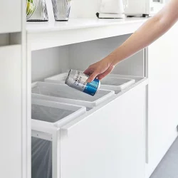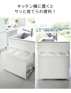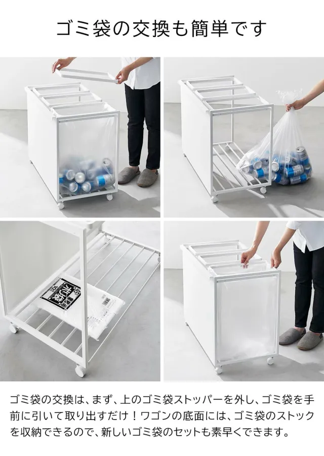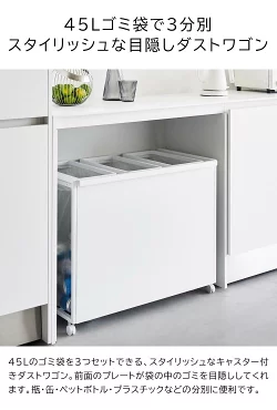目隠し分別ダストワゴン タワー 45L 3分別 ![]() 45Lゴミ袋を隠してセット 45Lのゴミ袋を3つセットできる、目隠し分別ダストワゴン。捨て場所に困る、瓶・缶・ペットボトル・プラスチックなどの分別に便利です。前面についている目隠しプレートが、中のゴミを上手に隠してくれます。蓋がないので、高さに制限のあるカウンター下や食器棚下にもスッキリと収まり、蓋を開ける手間もなくゴミをサッと捨てることができます。ハンドルとキャスター付きで移動がラクラク!ゴミ出しやお掃除の際にもスッと動かせます。ゴミ袋の交換も簡単です。上のゴミ袋ストッパーを外し、ゴミ袋を手前に引いて取り出すだけ!ワゴンの底面には、ゴミ袋のストックを収納できるので、新しいゴミ袋のセットも素早くできます。 ![]() ![]() ![]() ![]() ![]() ![]() ![]() ![]() ![]() ![]() ![]() ![]() ![]() ![]() ![]() |