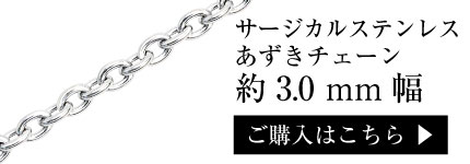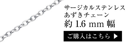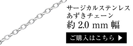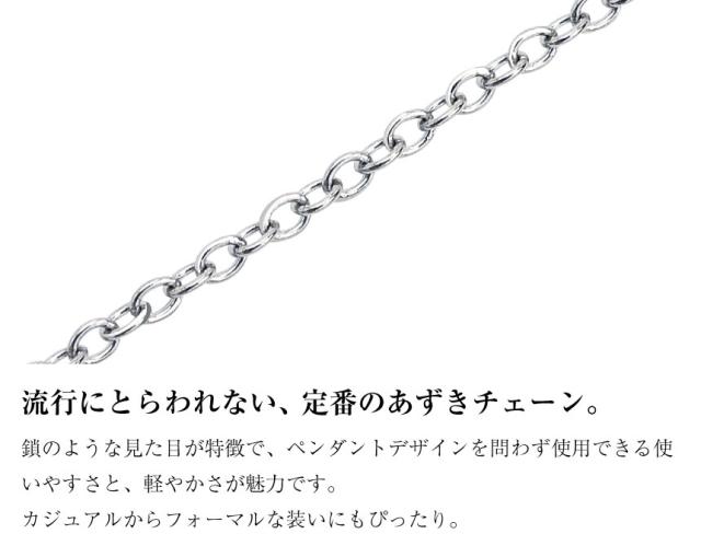 汗をかいても痒くなりにくい、サージカルステンレス製の小豆チェーン(あずきチェーン)。金属アレルギーの方にも安心してご使用いただけます。また硬く傷がつきにくく、長持ちするという特徴を持っているのでお手入れも簡単。末永く愛用できるため、プレゼントにもオススメです。