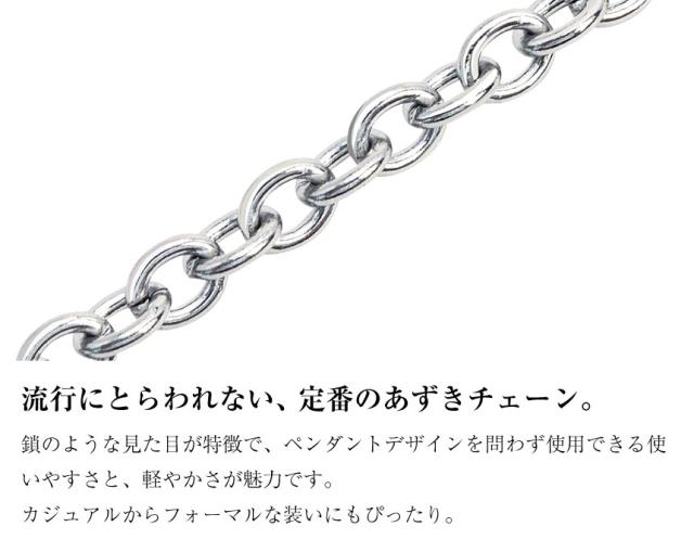 汗をかいても痒くなりにくい、サージカルステンレス製の小豆チェーン(あずきチェーン)。金属アレルギーの方にも安心してご使用いただけます。また硬く傷がつきにくく、長持ちするという特徴を持っているのでお手入れも簡単。末永く愛用できるため、プレゼントにもオススメです。