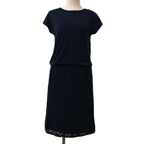 【中古】メルローズクレール ワンピース Iライン ひざ丈 ラウンドネック 切替 無地 レース フレンチスリーブ 紺