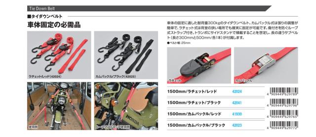 トランポにサイドスタンドで積載することを想定し、長の違うサブベルト(長さ300mmと500mm/各1本)が付属します。