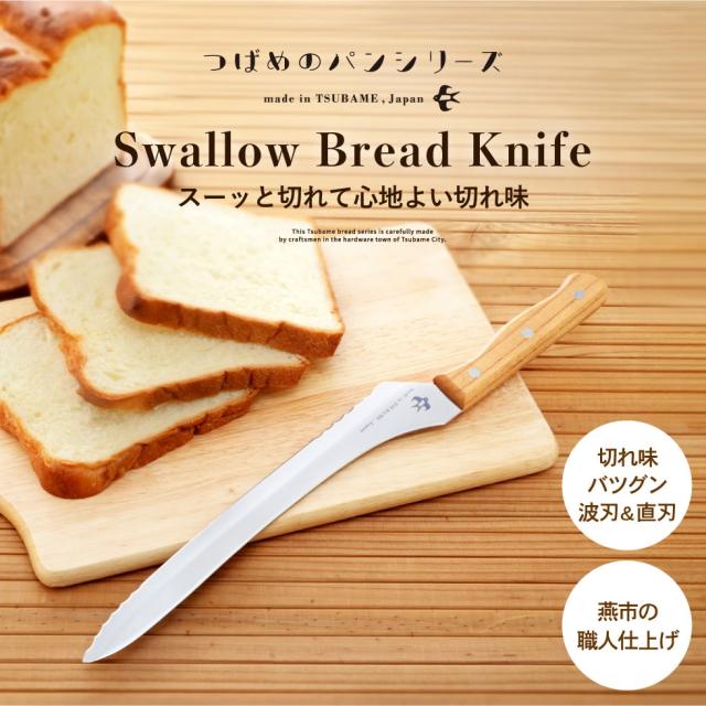 つばめのパンシリーズのナイフは、金物の町新潟県燕市の職人の手仕事による確かな逸品。つばめ印がかわいい刀身に温かみのあるパッケージ、ケヤキ材ハンドルのナチュラルな雰囲気は、パン好きの方へのギフトにもぴったりです。