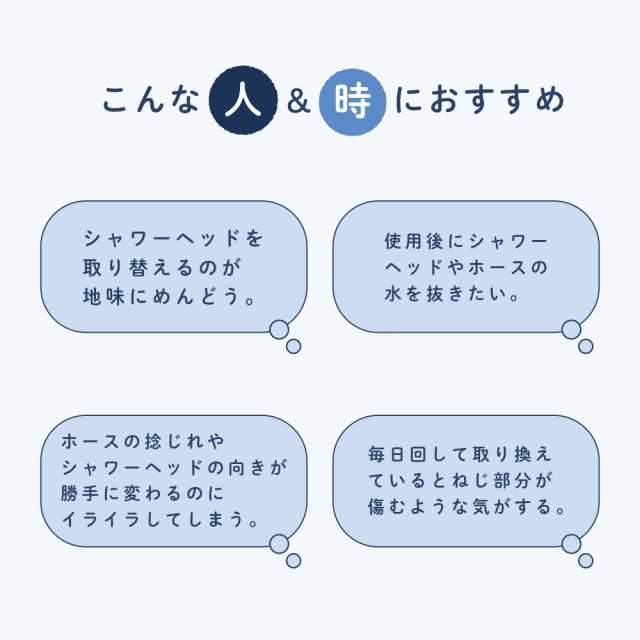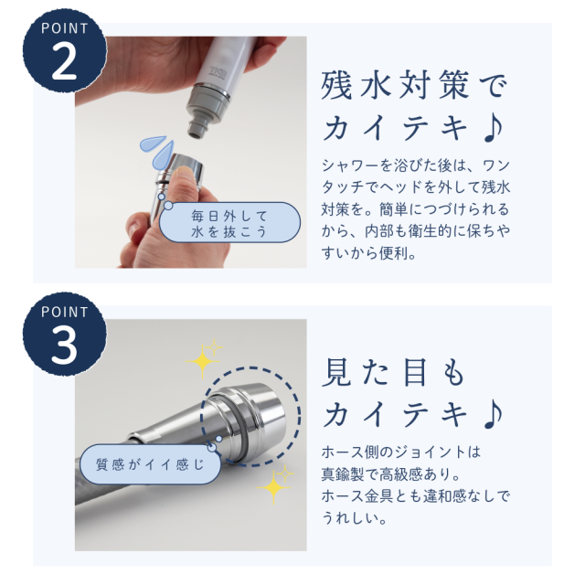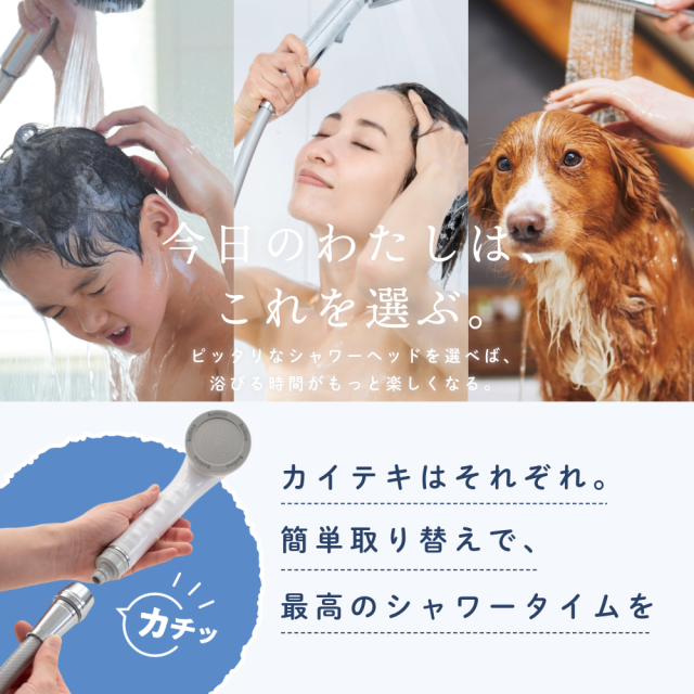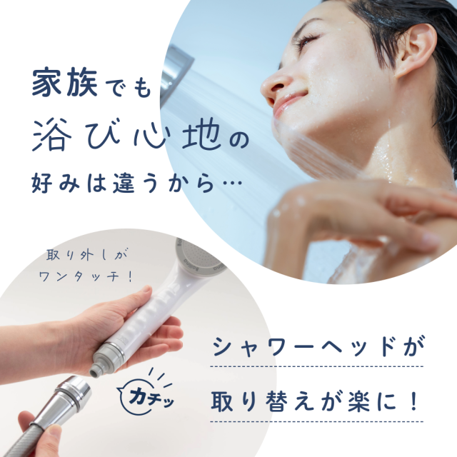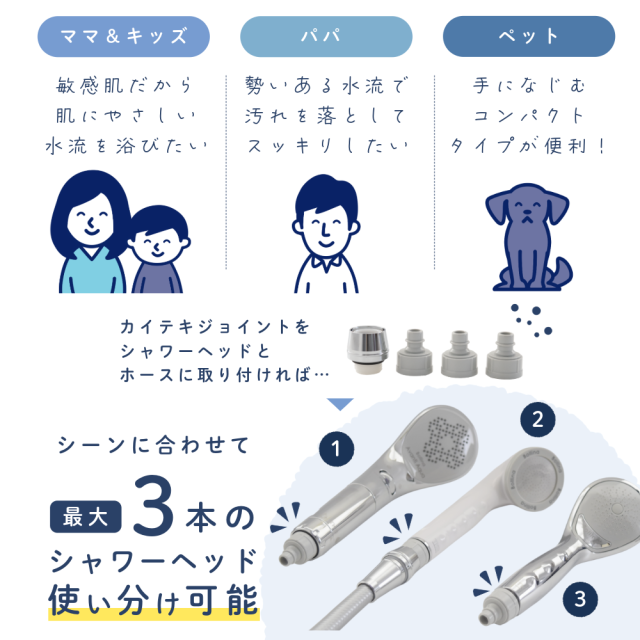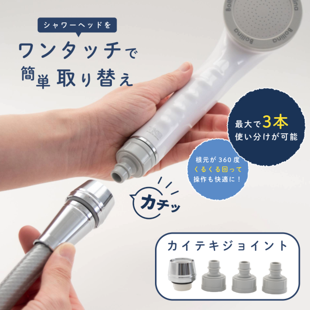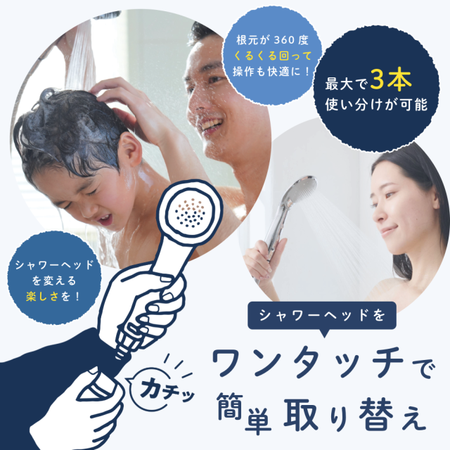 | 商品説明 | シャワーヘッドがワンタッチで簡単取り替え! ・最大で3本の使い分けが可能。人やシーンに合わせてシャワーヘッドが簡単に変えられる。 ・シャワーヘッドの根元が360度くるくる回るから操作性がUP ・水抜きが簡単にできるからシャワーヘッドの中も衛生的に。 |