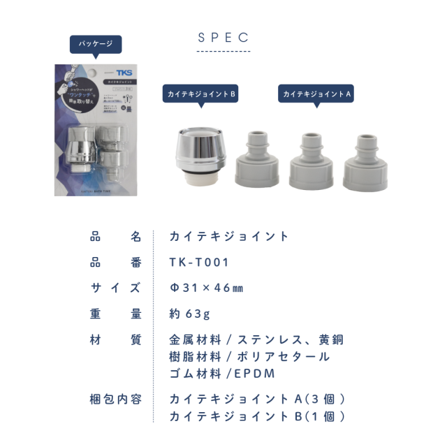 | 梱包内容 | カイテキジョイントA(3個)、カイテキジョイントB(1個) |