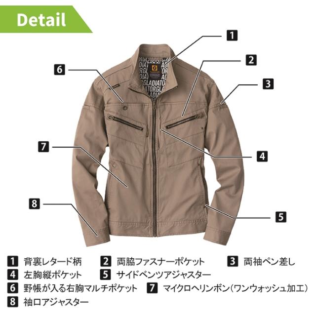 ◇機能:野帳が入る右胸マルチポケット・袖口アジャスター・両胸ファスナーポケット・左胸縦ポケット・両袖ペン差し