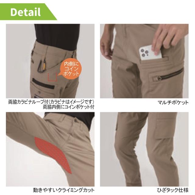 ◇機能:長財布が入る後ろポケット・動きやすいクライミングカット・ひざタック仕様・両脇カラビナループ付・両脇コインポケット付・マルチポケット