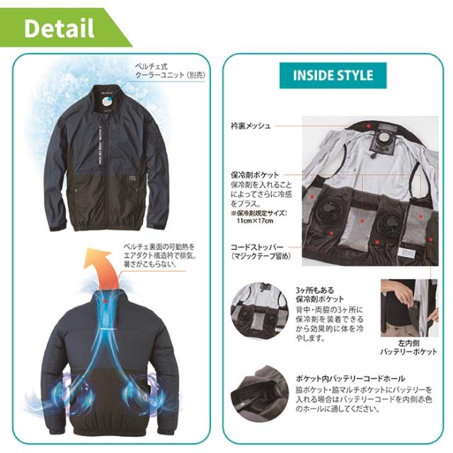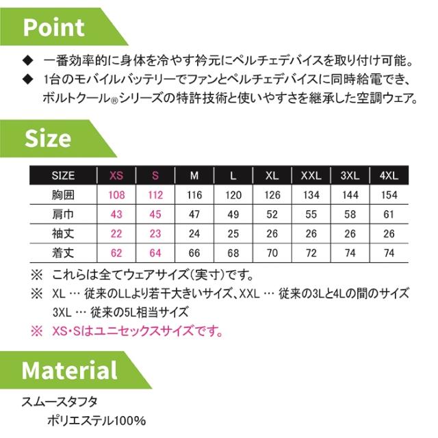 ◇一番効率的に身体を冷やす衿元にペルチェデバイスを取り付け可能。1台のモバイルバッテリーでファンとペルチェデバイスに同時供給できボルトクールシリーズの特許技術と使いやすさを継承した空調ウエア