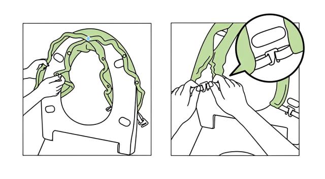 | 1、最初に真ん中ホックを便座の中央でとめ、他のホックをとめていきます。 | 2、プラスチックのフックを引っ張り、ゴムの輪に引っ掛けます。 |