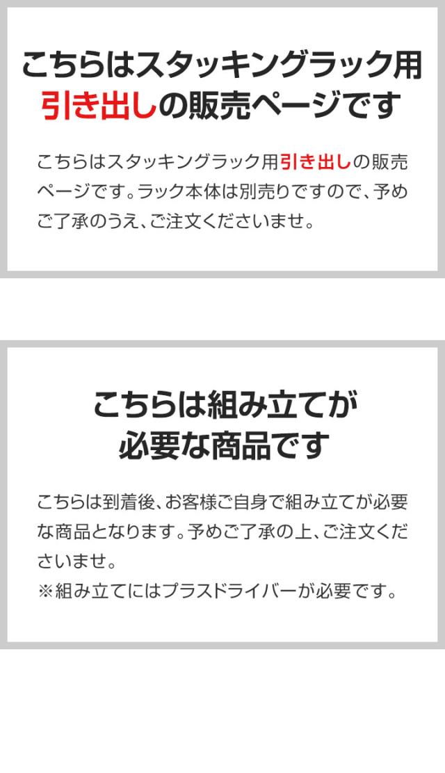 | 特記事項: ※スタッキングラック本体は別売りです。 ※こちらの商品はお客様組み立て品となります。 ※組み立てにはプラスドライバーが必要になります。 |